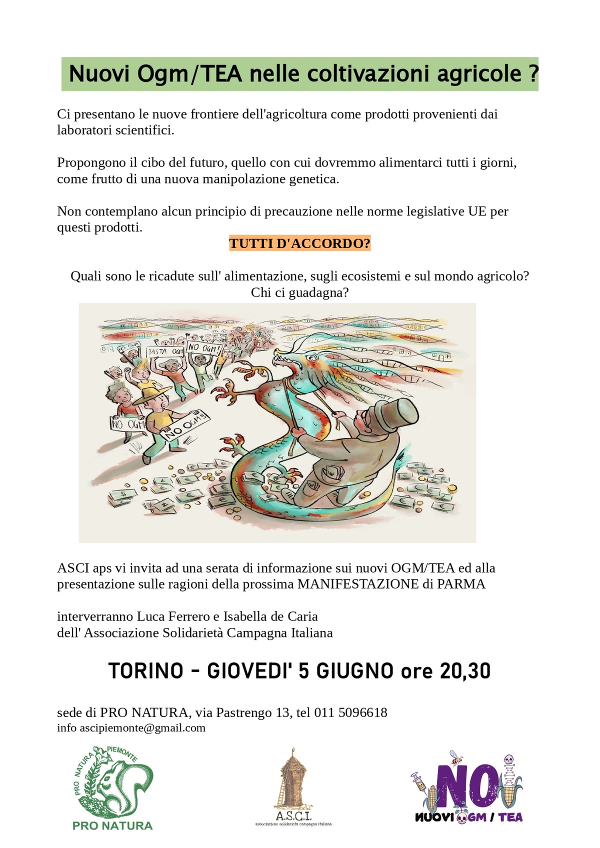 ASCI (Associazione Solidarietà Campagna Italiana) invita a un incontro di informazione sui nuovi OGM / TEA e alla presentazione delle motivazioni della prossima manifestazione di Parma del 14 giugno.