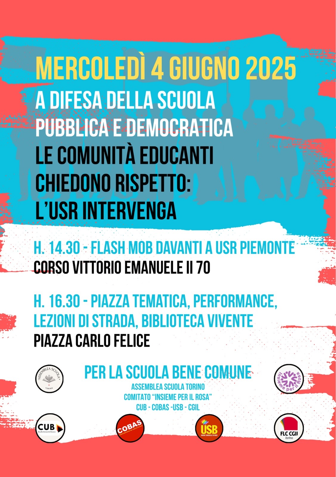 Che tu sia docente, ATA, studentessa/studente o semplice cittadina/o solidale, unisciti alla rete delle scuole che si stanno mobilitando e scendi in strada con noi mercoledì 4 giugno 2025.