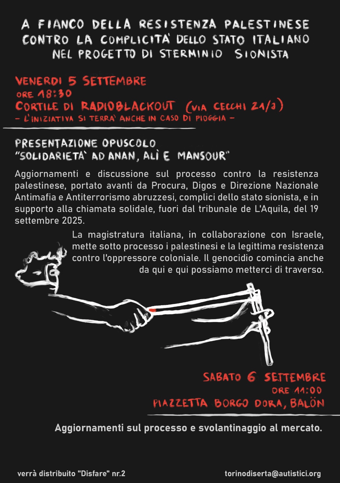Aggiornamenti e discussione sul processo contro la resistenza palestinese, portato avanti da Procura, Digos e Direzione Nazionale Antimafia e Antiterrorismo abruzzesi, complici dello stato sionista, e in supporto alla chiamata solidale, fuori dal tribunale de L'Aquila, del 19 settembre 2025.