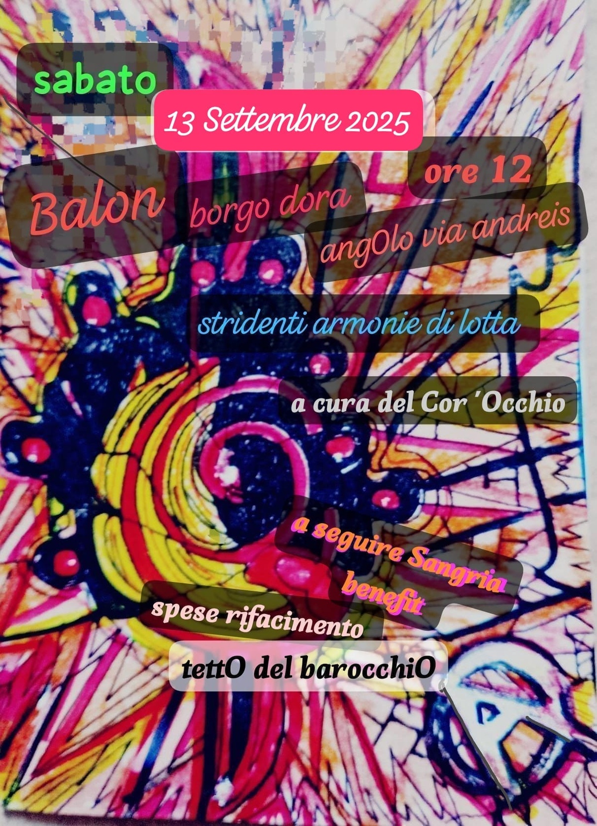 "Stridenti armonie di lotta" è l'appuntamento mensile, alle ore 12, al Balon, Borgo Dora angolo Via Andreis, a cura del Cor'okkio ".....la sempre più pesante e orrida realtà induce a uscire nelle strade con canti di lotta e letture, per denunciare l'intollerabile ed ingiusta persecuzione da parte dei poteri attraverso ogni forma di repressione.