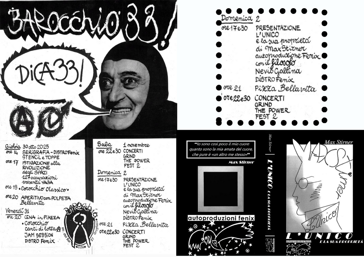 [2025-11-02] 33 ANNI DI OCCUPAZIONE BAROCCHIO SQUAT - domenica 2 novembre 2025 - presentazione de L'UNICO e la sua proprietà di Max Stirner in AUTOPRODUZIONI FENIX - distro Fenix - pizza BELLAVITA - CONCERTI @ BAROCCHIO SQUAT