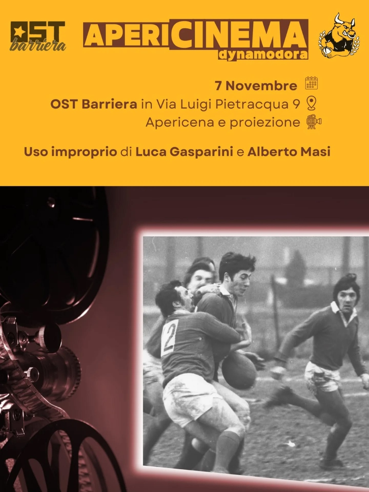 Cosa: proiezione di Uso improprio, film di Luca Gasparini sul rugby, lo sport popolare e la militanza politica. Tutto ciò con apericena e popcorn per essere felici.