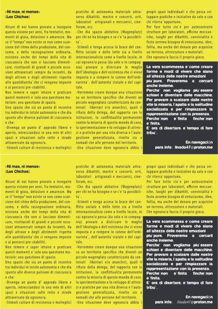 linee di vita e di lotta, e densità sociali da mappare,attraversare e saper maneggiare con perizia. Procedere a zigzag tessendo trame, orditi e complicità è gioco con le molteplici curvature degli spazi e dei tempi, sia individuali che sociali. È una questione di volontà e di attrezzi che possano servirci ad agganciare occasioni che si profilano nella navigazione, come a saperci sganciare da ordinarietà, autoritarismi e dalla forza di gravità sociale che ci tiene schiacciati al suolo del sempre identico e della solitudine digitalizzata. Per imbastire trame, momenti e mezzi per navigare necessitiamo di spazi e di materiali sulle rotte dove poter sperimentare forme di vita altra e di lotta. Stiamo provando a dare presa e corpo ad un nostro sogno: un punto d approdo sulle strade dove poterci incontrare e respirare assieme. Siamo una piccola tribù di nomadi e seminomadi delle Terre occidentali d’ Europa. Qui, nella zona di agen, stiamo cercando un terreno dove provare a dare vita a tutto ciò.
