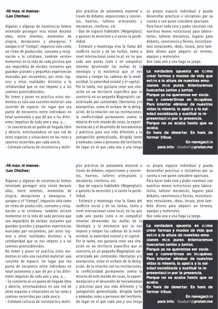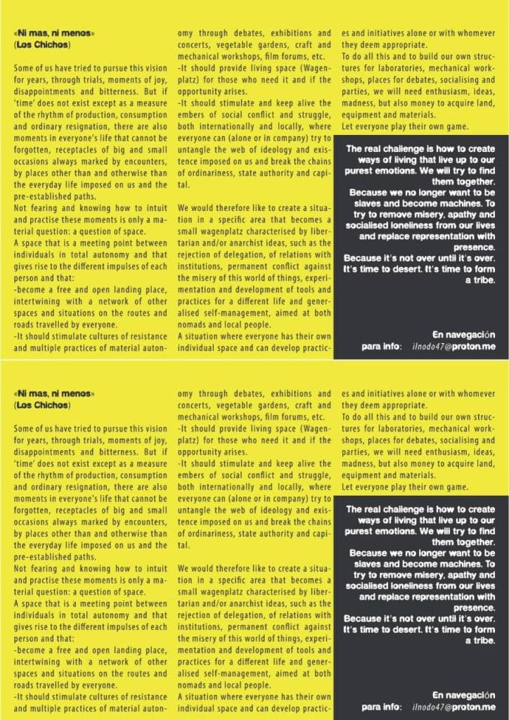 Líneas de vida y de lucha, y densidades sociales que hay que cartografiar, atravesar y saber manejar con destreza. Avanzar en zigzag tejiendo tramas, urdimbres y complicidades es un juego con las múltiples curvaturas de los espacios y los tiempos, tanto individuales como sociales. Es una cuestión de voluntad y de herramientas que nos sirvan para aprovechar las oportunidades que se perfilan en la navegación, así como para saber desprendernos de la mediocridad, los autoritarismos y la fuerza de gravedad social que nos mantiene aplastados al suelo de lo siempre igual y de la soledad digitalizada. Para tejer tramas, momentos y medios para navegar, necesitamos espacios y materiales en las rutas donde podamos experimentar otras formas de vida y de lucha. Estamos intentando hacer realidad nuestro sueño: un lugar en las carreteras donde poder encontrarnos y respirar juntos. Somos una pequeña tribu de nómadas y seminómadas de las tierras occidentales de Europa. Aquí, en la zona de Agen, estamos buscando un terreno donde intentar dar vida a todo esto.